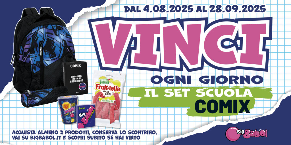Con il concorso BACK TO SCHOOL 2025 puoi vincere ogni giorno 1 set scuola Comix! Ogni set Comix è composto da: 1 Zaino Urban collezione Comix Twen – cm. 30x41x19 del valore di € 55,00 iva inclusa; 1 Astuccio Urban collezione Comix Twen – cm. 22x6x6 del valore di € 12,00 iva inclusa; 1 Diario 13 mesi Comix, 464 pagine, formato standard cm. 13×18 del valore di € 14,90 iva inclusa. Nel periodo indicato, tutti i consumatori maggiorenni che acquisteranno, in un’unica spesa, almeno 2 confezioni di prodotto a propria scelta tra quelle in promozione, nei punti vendita che aderiscono alla manifestazione ed espongono il relativo materiale promozionale, potranno partecipare al presente concorso, utilizzando i dati del documento di acquisto “parlante”.