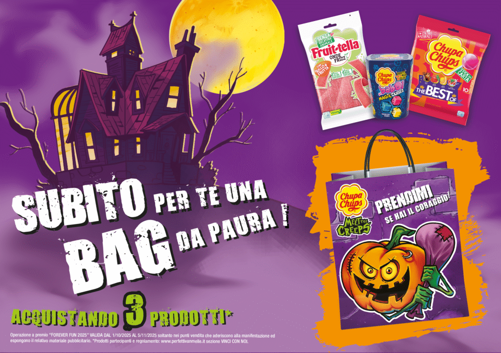 Acquista 3 prodotti tra quelli in promozione e ricevi la tua Bag Halloween personalizzata Chupa Chups! Dal 01.10.2025 al 05.11.2025, presso alcuni punti vendita della grande distribuzione che aderiranno all’iniziativa, verranno posizionati degli espositori auto vendenti che veicolano i prodotti in promozione oltre al relativo omaggio. Tutti i consumatori che, nelle giornate in cui sarà presente l’espositore, acquisteranno 3 confezioni di prodotti a scelta tra quelle in promozione riceveranno immediatamente il premio consistente in una Bag Halloween personalizzata Chupa Chups.